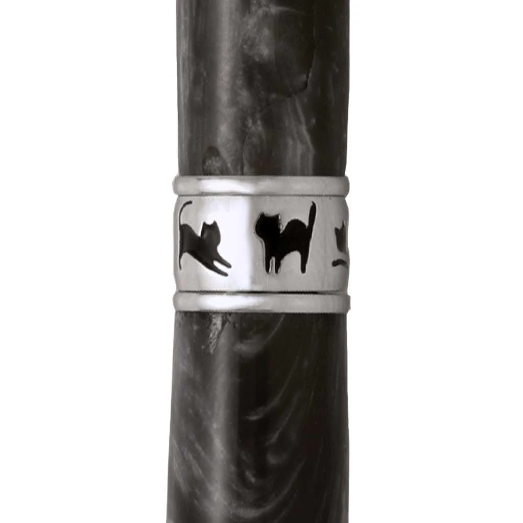 It will be used and appreciated to express their love and devotion to that special kitty cat. Your handmade cat pen will capture this special relationship through the pen's fine details; The pen end features an end cap with a sleeping cat sculpted into a weaved basket with the kitties full, curved tail playfully falling out to act as the sturdy pen clip. The center band is wrapped with silhouettes of cat caricatures in different spirited positions and decorated with rope trim. The pen tip is engraved with a playful pattern of cat paw prints with rope trim.