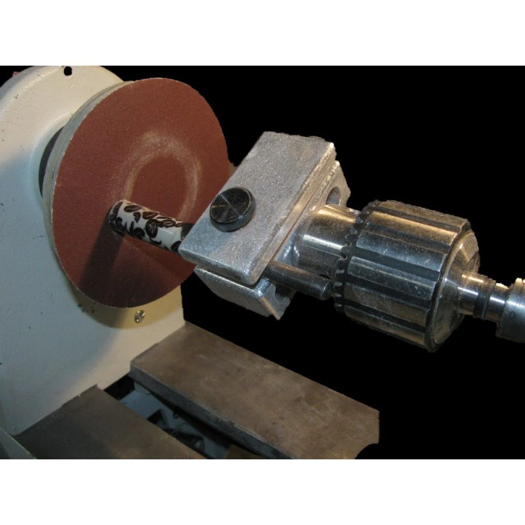 Square the ends of any pen blank easily and safely! No more pen mill chip-outs! Choose the correct size transfer punch that will fit your blank (Punch set can be found here ) and mount it in one of the "through holes". You are then ready to perfectly trim your blank's ends on your lathe, with the additional equipment shown in one picture (Sanding disc, punch set and Jacob's chuck (drill bit holder).
