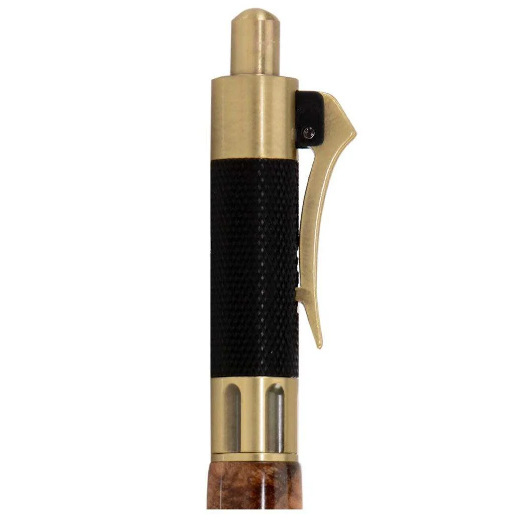 Meticulously and handsomely reproduced from an actual revolver, this nostalgically stylish pen looks and works just like a real revolver. It is the perfect gift for any gun aficionado. When you press the click mechanism the pen tip extends, the trigger clip moves up and the 6-barrel cylinder rotates to replicate you loading the gun. Then, when you pull the hairpin trigger pen clip the tip retracts while the 6-barrel cylinder quickly spins to replicate you firing the gun. Right above the cylinder, you'll find a black metal grip that mimics a revolver handle. And the bullet cartridge pen tip represents your favorite .38 Special or .357 Magnum bullet.