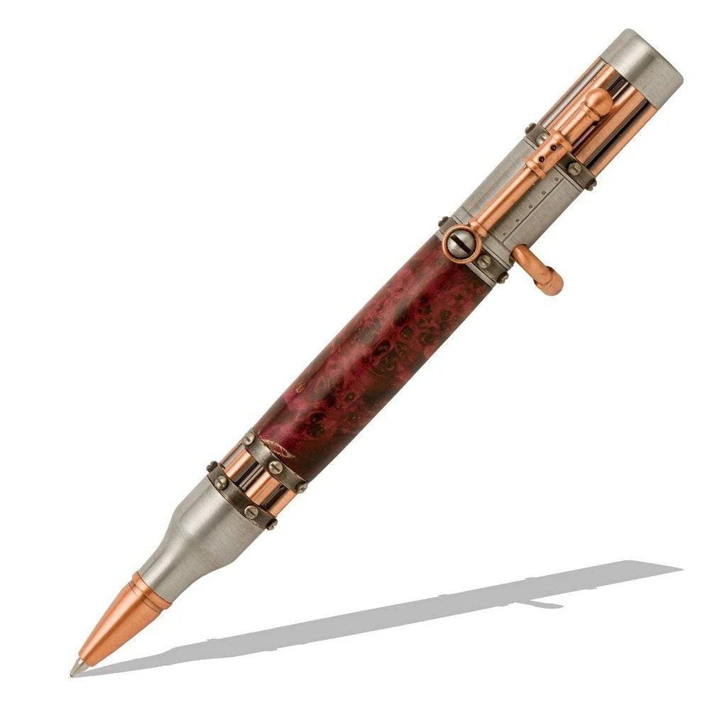 These pen kits embody that aesthetic, featuring flat head screws, riveted patterns, replica Gattling gun barrels, a Bolt Action mechanism, and a mix of Antique copper, pewter, and brass finishes. Steampunk has become a prominent trend in fashion, jewelry, and design, offering you the opportunity to craft the perfect Steampunk-themed pen. Experience smooth writing performance with a Parker-style refill.